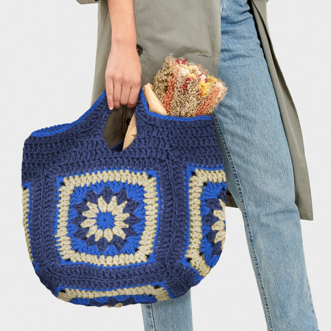 Este kit incluye todo lo que necesitas para tejer tu bolso de grannies, dependiendo del color que elijas: